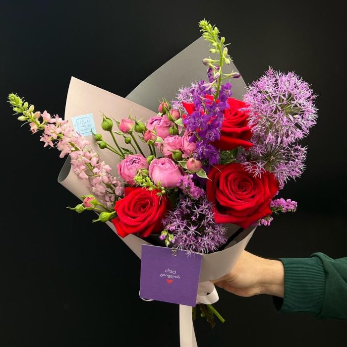 Роза Эквадор – 3 шт. Луковичные растения – 3 шт. Пионовидная кустовая роза – 1 шт. Лимониум – 2 шт. Упаковка дизайнерская – 2 шт. Открыточка с вашими пожеланиями – 1 шт. инструкция по уходу за цветами – 1 шт.