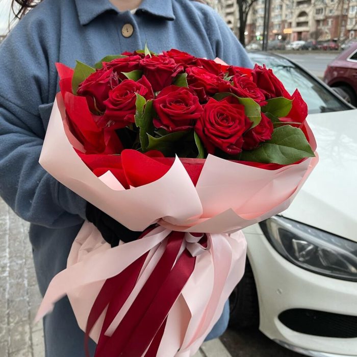 Салал – 8 шт.Лента атласная – 6 шт.Пленка – 9 шт.Роза красная россия 50 см – 15 шт.