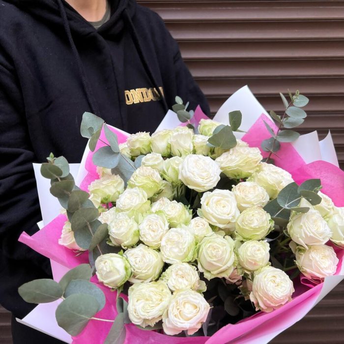 Эвкалипт – 7 шт.Лента атласная – 2 шт.Тишью – 2 шт.Пленка матовая – 2 шт.Роза кустовая пионовидная бомбастик – 15 шт.