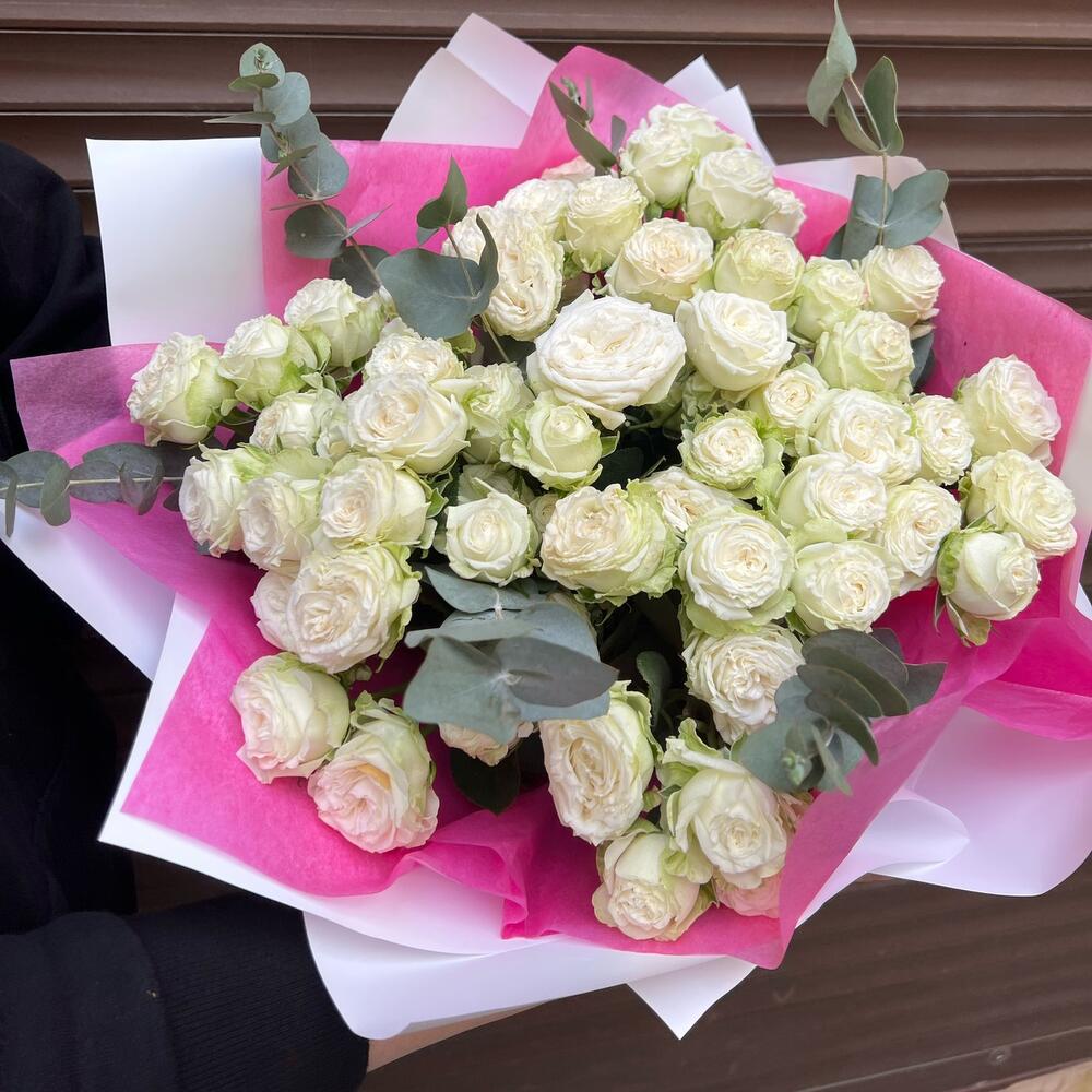 Букет из 15 белых пион роз кустовых с эвкалиптом (сб 015)