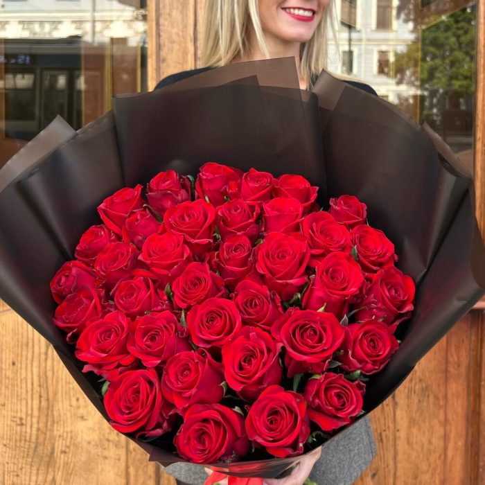 Роза красная 60 см – 35 шт.Дизайнерская упаковка – 5 шт.Лента атласная – 2 шт.