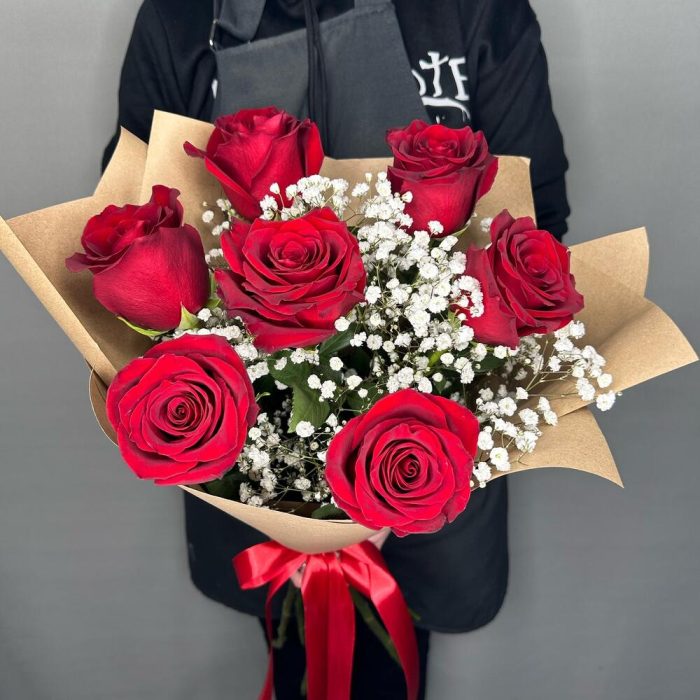 Букет из 7 красных роз и белой гипсофилы “Классика”