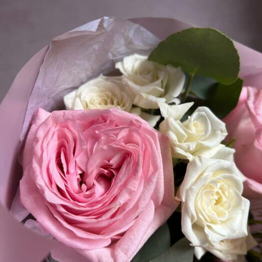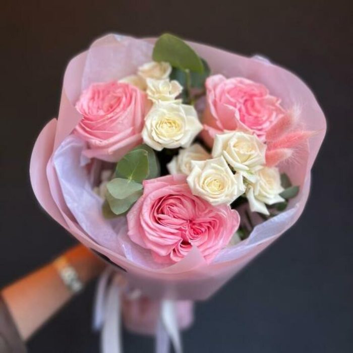 Пионовидная роза – 3 шт.Пионовидная кустовая роза – 2 шт.Эвкалипт – 2 шт.Лагурус – 3 шт.декоративная упаковка – 1 шт.Атласная лента – 1 шт.