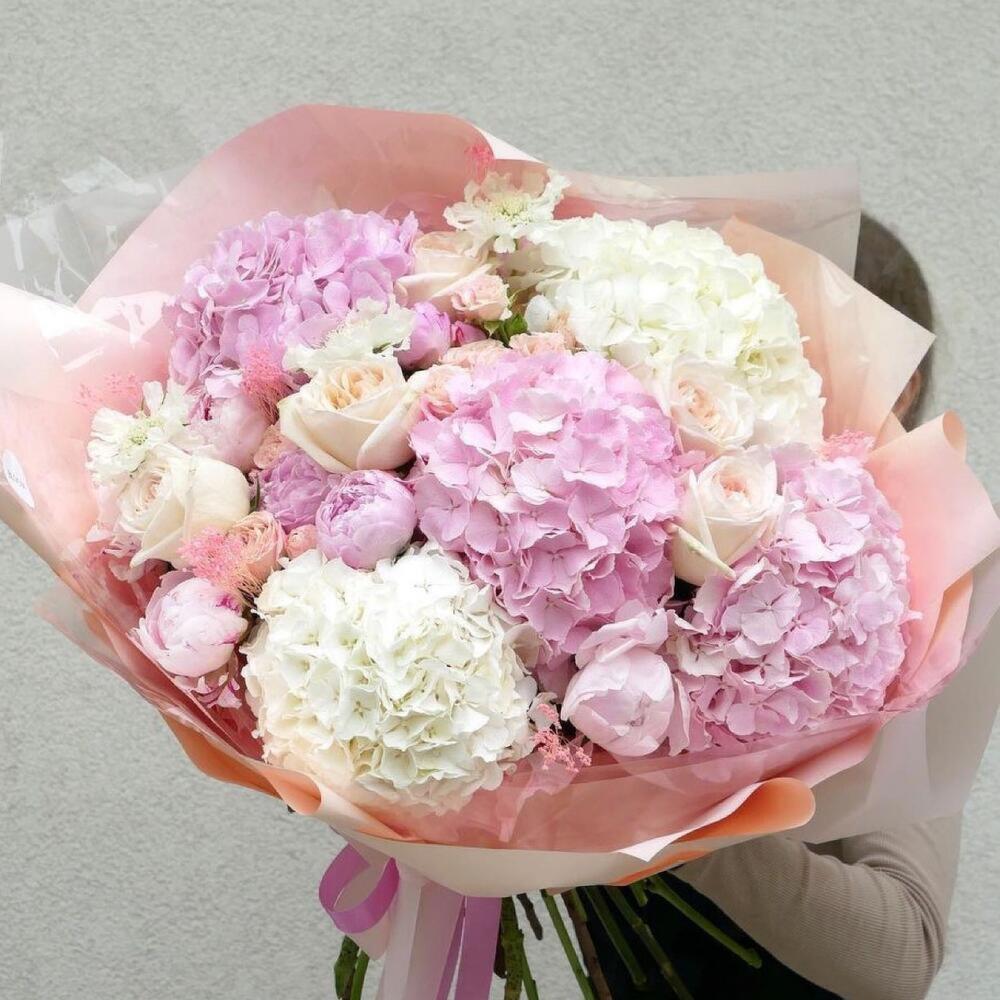 Букет из гортензий, пионов и пионовидных роз «Струны души»