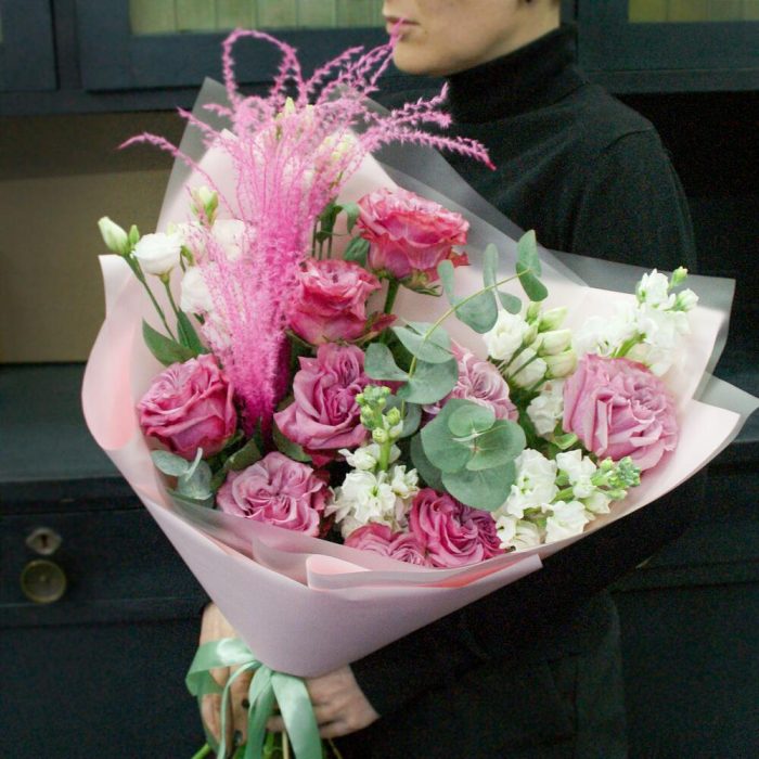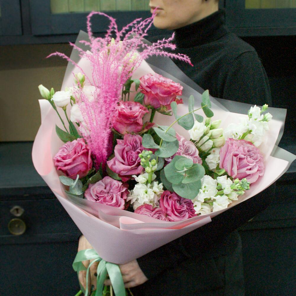 Лизиантус – 3 шт.Маттиола – 3 шт.Эвкалипт – 3 шт.Роза пионовидная – 9 шт.Дизайнерская упаковка – 1 шт.мискантус – 2 шт.