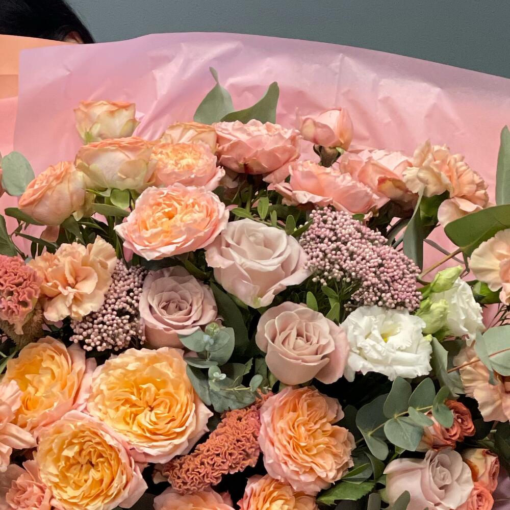 Роза пионовидная кустовая – 4 шт.Роза одноголовая – 5 шт.Гвоздика сортовая – 7 шт.Лизиантус – 3 шт.Ваксфлауэр – 1 шт.Роза кустовая – 2 шт.Озотамнус – 2 шт.Эвкалипт – 3 шт.Фисташка – 5 шт.Упаковка – 3 шт.Лента атласная – 2 шт.