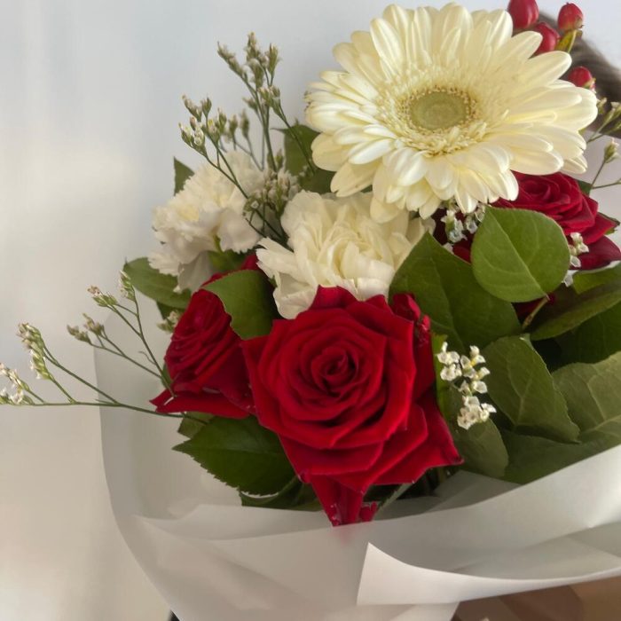 Гиперикум – 1 шт.Лимониум – 1 шт.Роза красная – 3 шт.Гвоздика – 2 шт.Гербера – 1 шт.Салал листья – 2 шт.Пленка матовая – 6 шт.