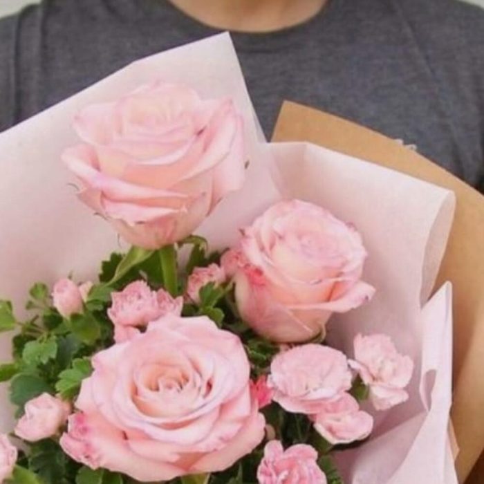 Роза – 3 шт.Гвоздика кустовая – 4 шт.Зелень – 3 шт.Упаковка дизайнерская – 5 шт.Лента атласная – 1 шт.