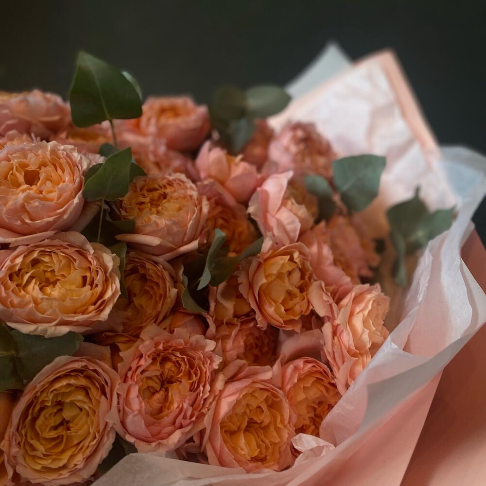 Кустовая пионовидная роза – 25 шт.Эвкалипт – 6 шт.Дизайнерская упаковка – 1 шт.Лента атласная – 1 шт.