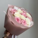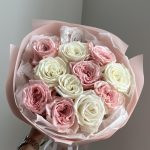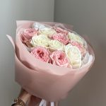 роза пионовидная плая бланка – 5 шт.пленка матовая полупрозрачная – 1 шт.тишью белая хрустящая – 1 шт.роза питновидная pink o’hara – 6 шт.
