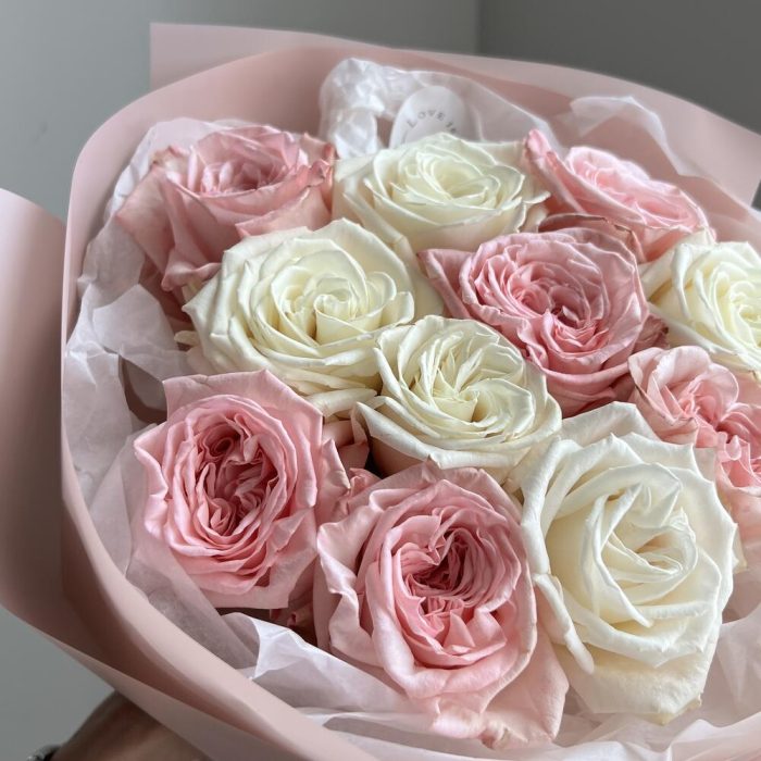 роза пионовидная плая бланка – 5 шт.пленка матовая полупрозрачная – 1 шт.тишью белая хрустящая – 1 шт.роза питновидная pink o’hara – 6 шт.