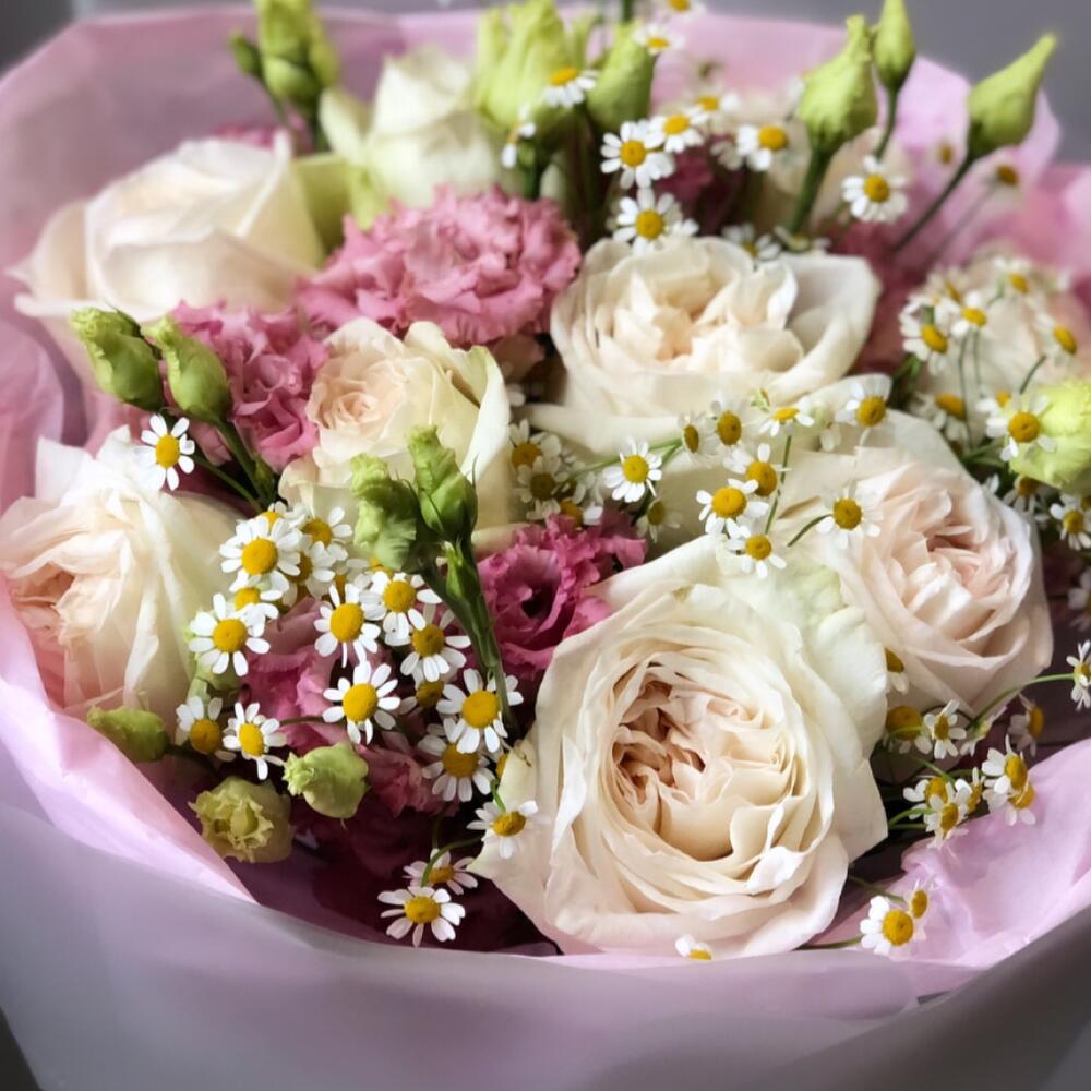 роза white o’hara – 9 шт.Эустома – 3 шт.Матрикария (Ромашка Камила) – 4 шт.Тишью – 2 шт.Упаковка дизайнерская – 2 шт.Лента атласная – 1 шт.
