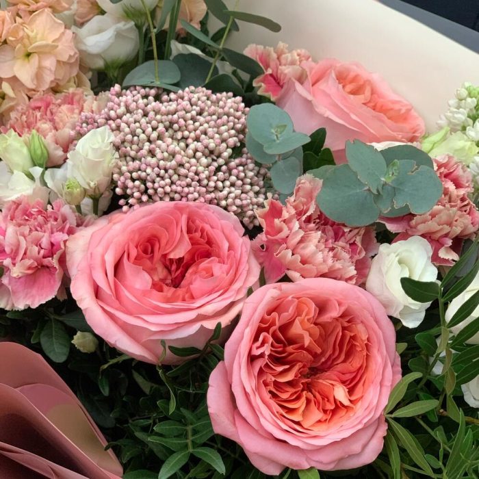 Сирень – 1 шт.Озотамнус – 1 шт.Гвоздика – 5 шт.Роза – 3 шт.Лизиантус – 2 шт.эвколиптом – 1 шт.Зелень – 3 шт.левкое – 3 шт.Дизайнерская упаковка – 3 шт.