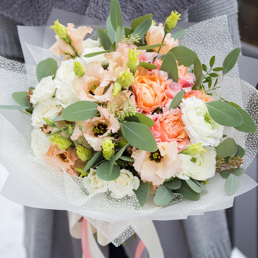 роза садовая пионовидная – 2 шт.Эвкалипт – 2 шт.Роза – 2 шт.Лизиантус – 5 шт.