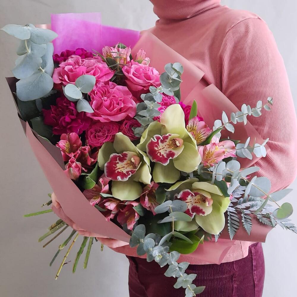 Роза кустовая – 2 шт.Альстромерия – 4 шт.Диантус – 3 шт.Орхидея Цимбидиум – 3 шт.Роза – 3 шт.Эвкалипт – 4 шт.Рускус – 13 шт.Упаковка дизайнерская – 2 шт.Лента атласная – 1 шт.