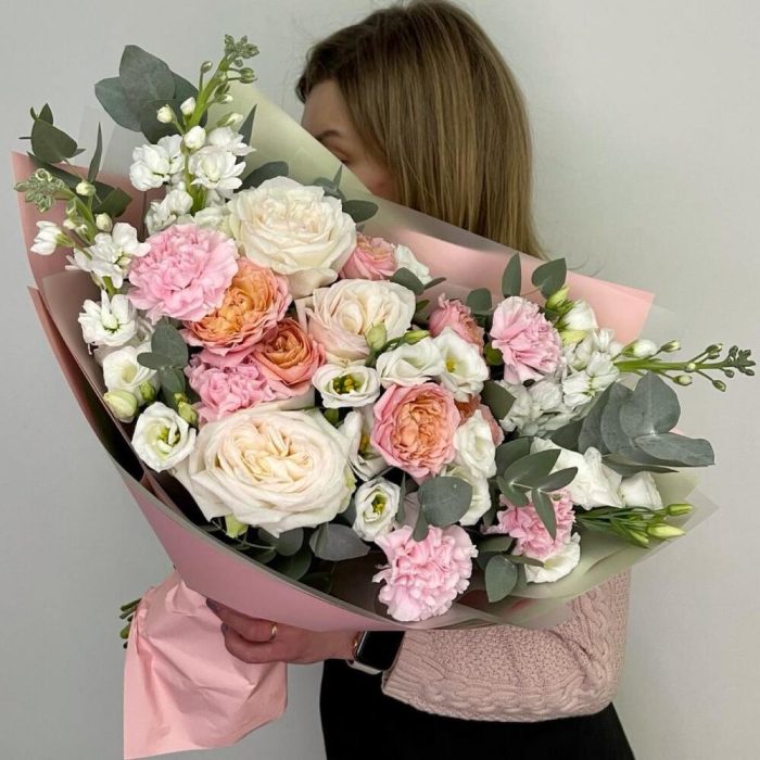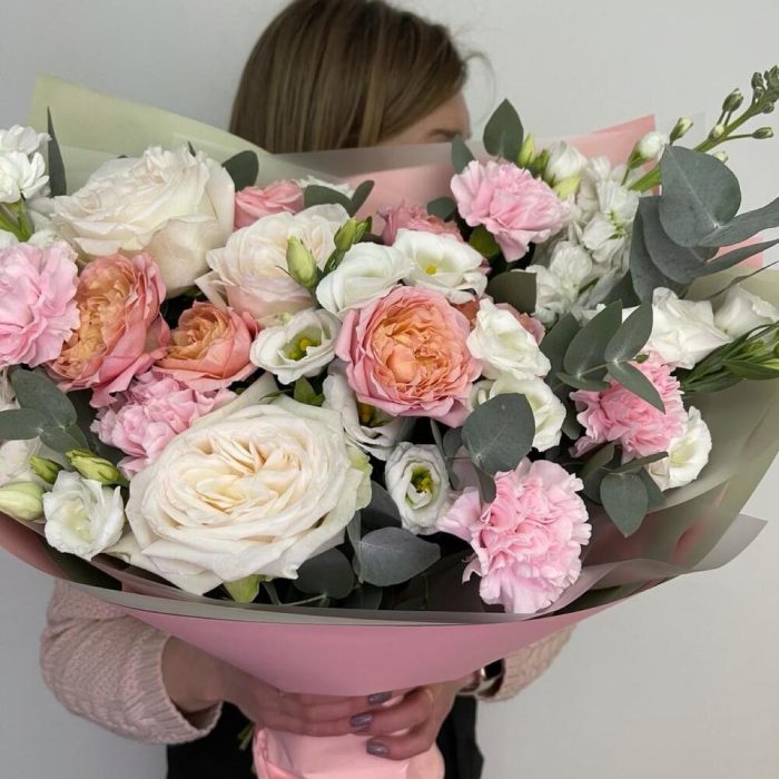 Лизиантус – 2 шт.Маттиола – 3 шт.Эвкалипт – 3 шт.Роза Эквадор – 3 шт.Диантус – 5 шт.Фисташка – 3 шт.Упаковка дизайнерская – 3 шт.роза пионовидная кустовая джульетта – 2 шт.