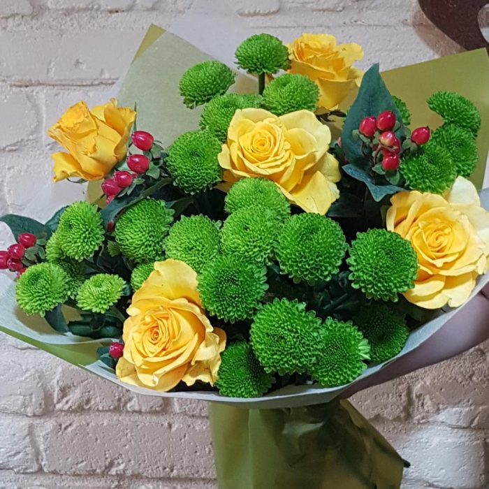Филин грин – 5 шт. Роза желтая – 5 шт. Гиперикум красный КУСТОВОЙ – 2 шт. Крафт упаковка – 1 шт. Агапантус – 1 шт.