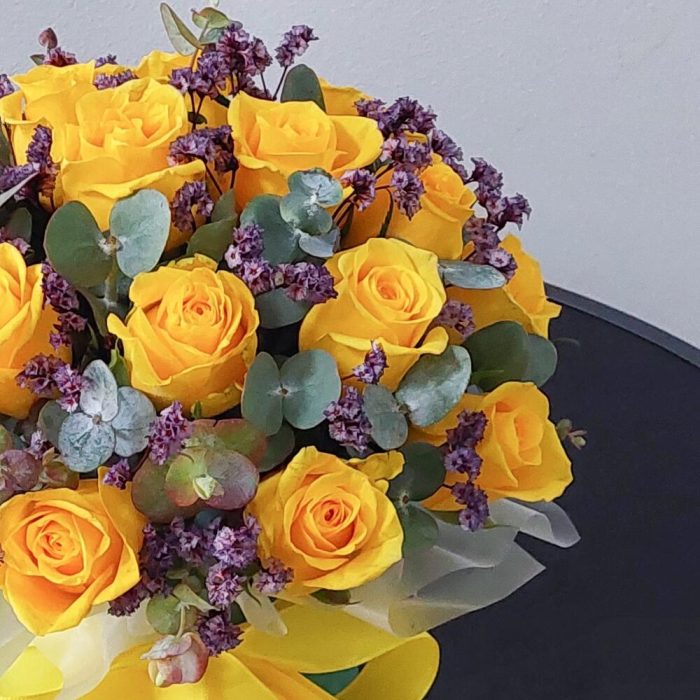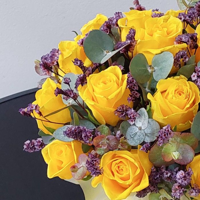 Классическая композиция в шляпной коробке из 21 яркой жёлтой розы, эвкалипта и стабилизированного лимониума