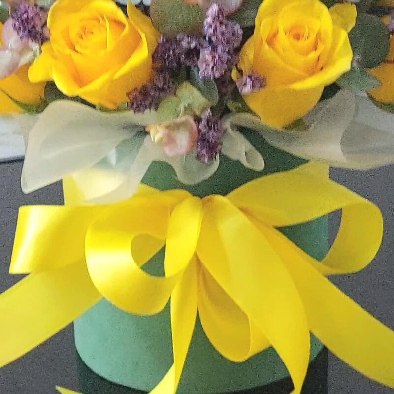Роза желтая – 21 шт.Лента атласная – 2 шт.Коробка шляпная – 1 шт.Пленка матовая – 1 шт.Открыточка с вашими пожеланиями – 1 шт.Эвкалипт Baby Blue – 4 шт.лимониум стабилизированный – 3 шт.транспортировочная упаковка – 1 шт.