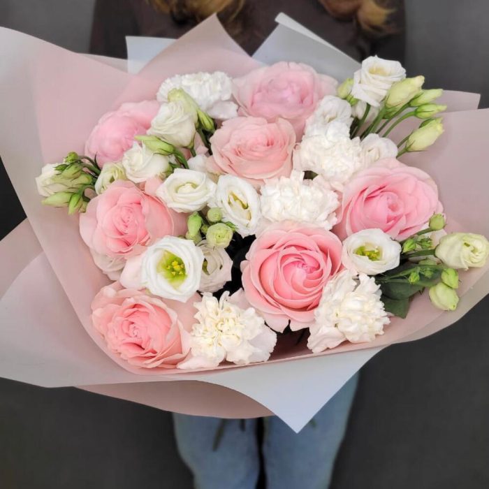Лизиантус – 4 шт.Роза Эквадор – 7 шт.Лента атласная – 1 шт.Диантус – 5 шт.Упаковка дизайнерская – 5 шт.