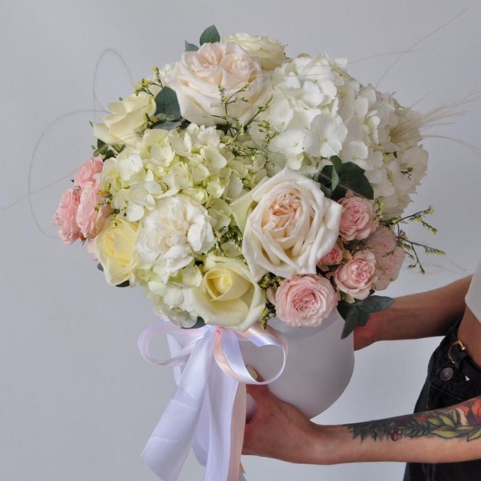 Гортензия и пионовидные розы Охара в большой коробке “Белоснежка”