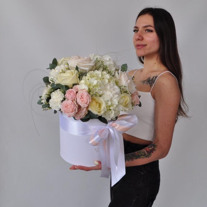 Коробка шляпная – 1 шт.Оазис флористический – 2 шт.Лента атласная – 2 шт.Гортензия белая – 2 шт.Гвоздика – 4 шт.розы кустовые пионовидные – 5 шт.Роза пионовидная – 5 шт.Роза Россия – 5 шт.Лимониум – 1 шт.Эвкалипт – 1 шт.Ковыль – 3 шт.