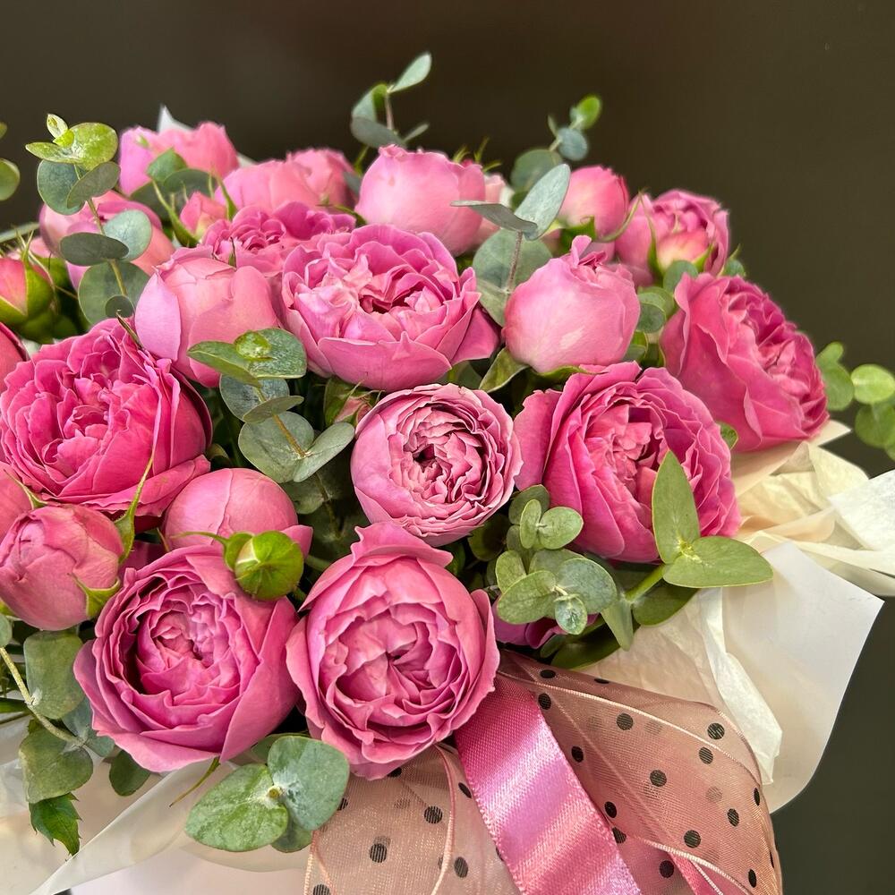 Композиция в коробке из Кустовых пионовидных роз и эустомы