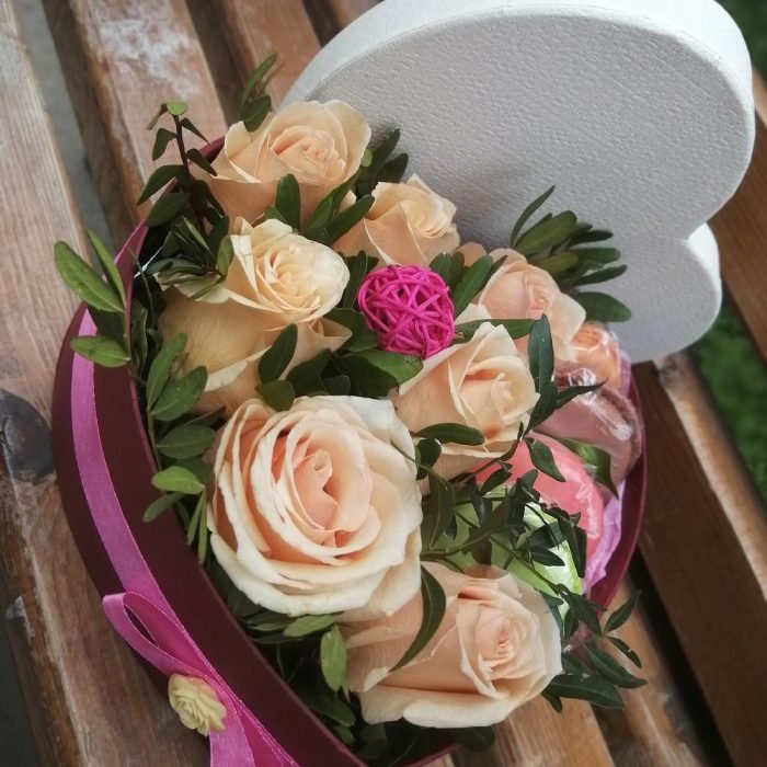 Роза – 7 шт.Зелень – 1 шт.Коробка – 1 шт.Оазис флористический – 1 шт.Макарон – 4 шт.