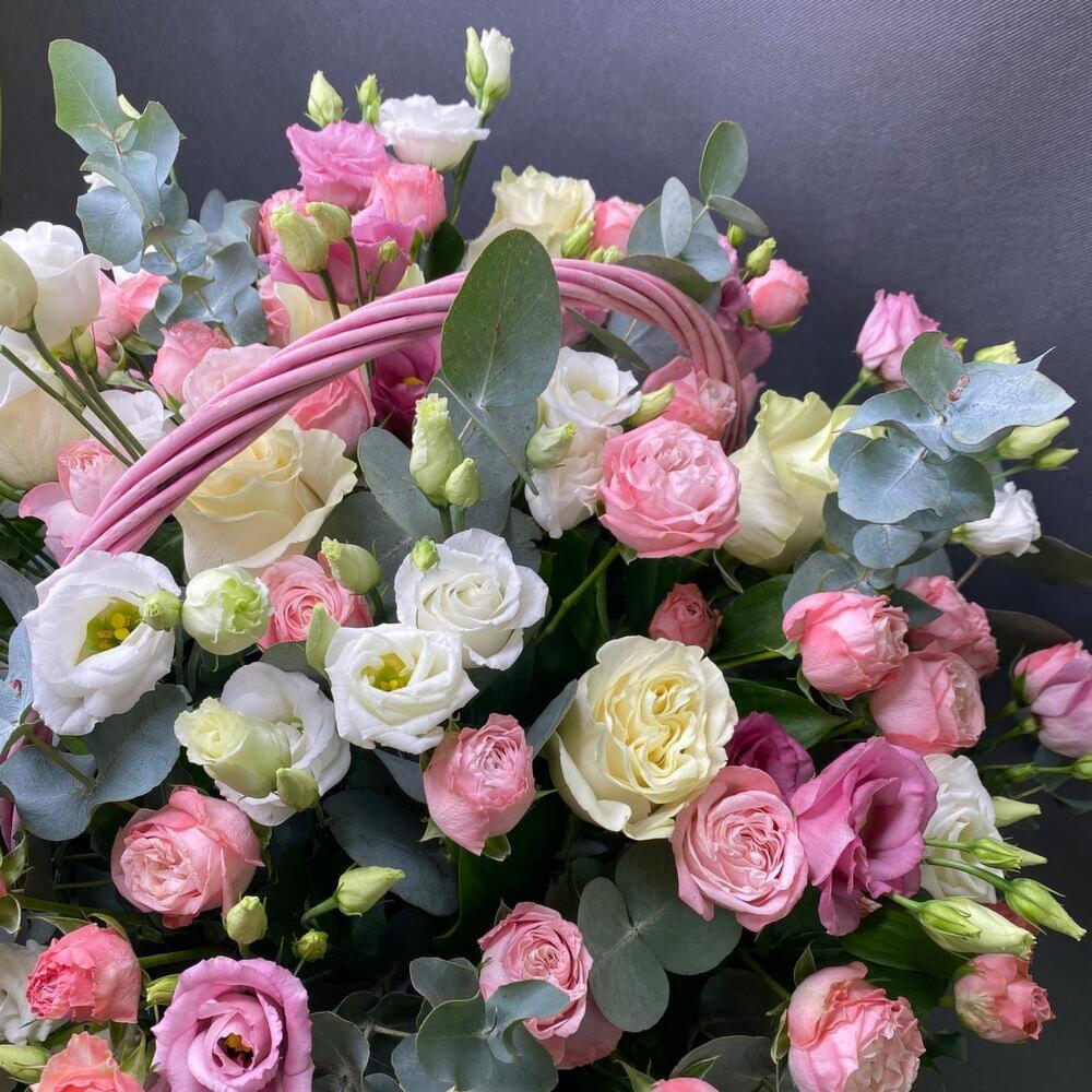 Роза Эквадор – 7 шт.Роза кустовая пионовидная – 7 шт.Лизиантус – 7 шт.Рускус – 10 шт.Эвкалипт – 2 шт.Оазис флористический – 2 шт.Корзина большая – 1 шт.