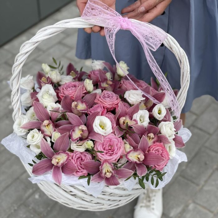 Корзина Розовое наслаждение из цимбидиума, роз и эустомы