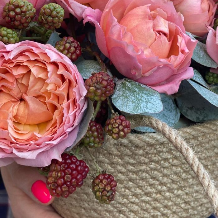 Эвкалипт – 3 шт.Роза кустовая пионовидная – 5 шт.кашпо джутовое ручной работы – 1 шт.