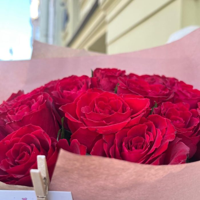 ЛЮБЛЮ 25 красных стойких роз в крафте