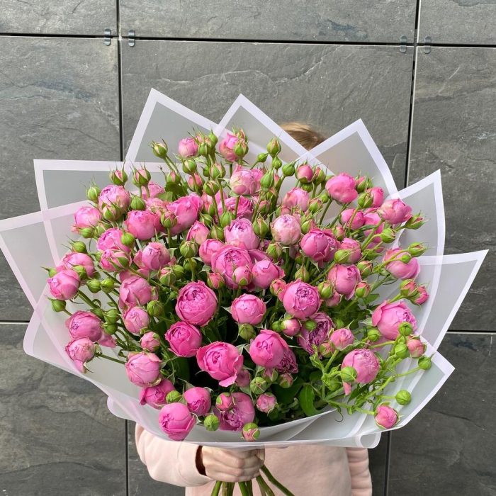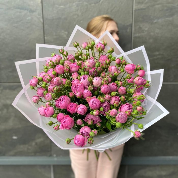 Лента атласная – 1 шт.Упаковка дизайнерская – 5 шт.роза кустовая пионовидная мисти бабл – 15 шт.
