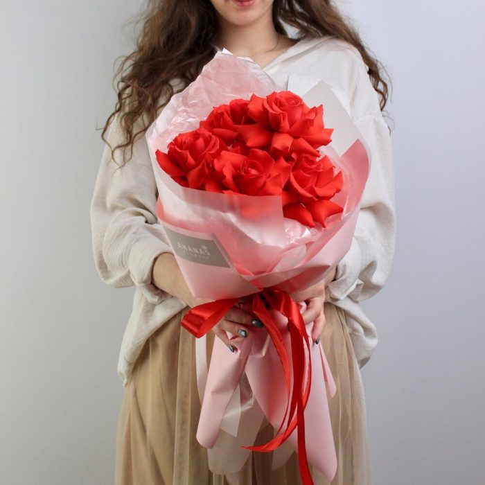 Яркий букет из насыщенно-красных пышных Эквадорских вывернутых роз в дизайнерской упаковке