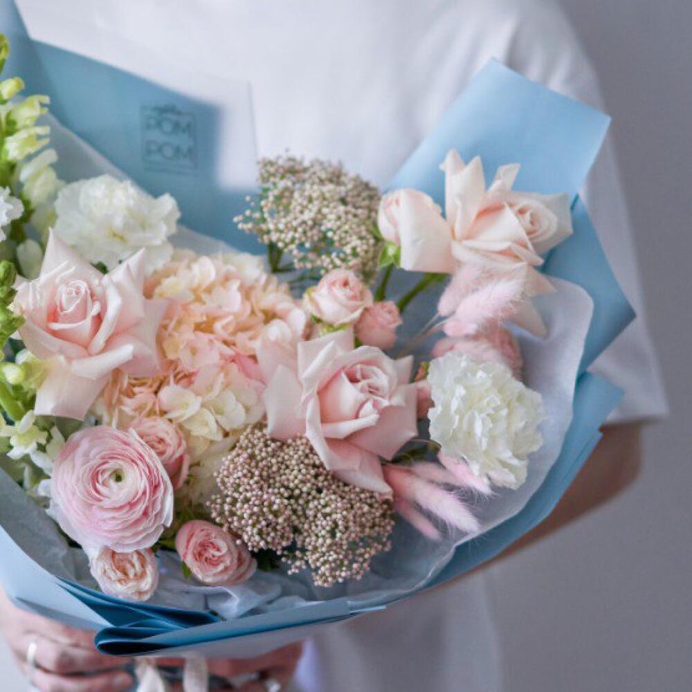 Гортензия – 1 шт.антиринум – 2 шт.Роза – 5 шт.Гвоздика – 3 шт.Лагурус – 1 шт.Озотамнус – 2 шт.Упаковка дизайнерская – 1 шт.