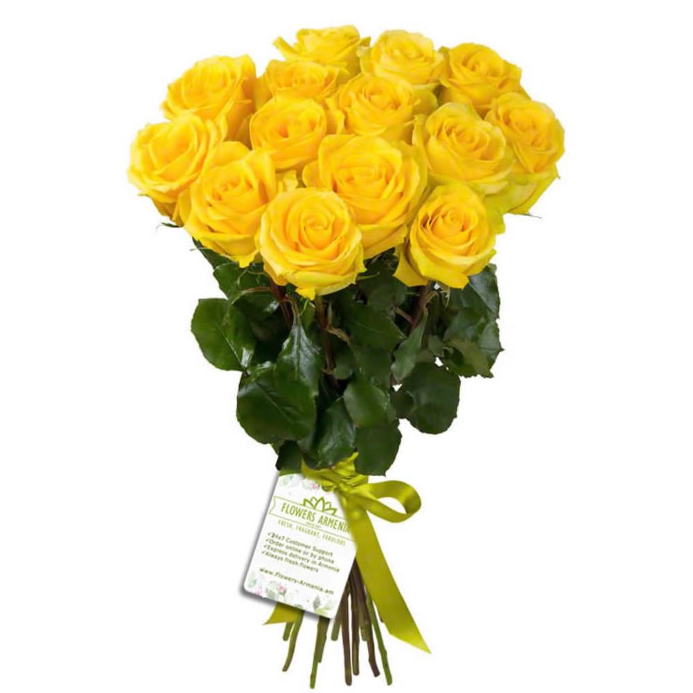 желтые розы – 15 шт. зеленая лента – 1 шт.