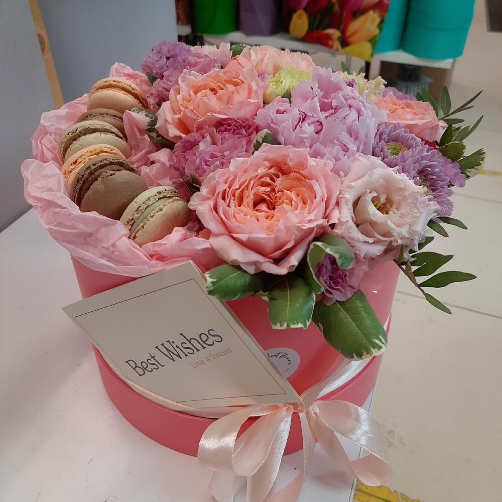 Очень стильная и нежная композиция из свежих цветов с любимыми французскими пирожными макарон.За счет флористической губки цветы в композиции долго сохраняют свежесть. А стильный дизайн произведет впечатление и запомнится Доставим быстро и бережно в специальной транспортировочной … Показать ещёупаковке Flowwow