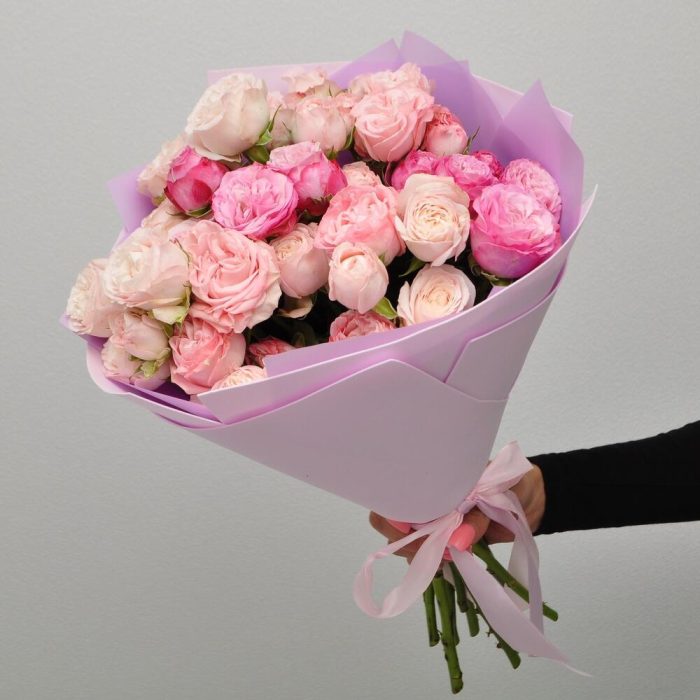 Лента атласная – 1 шт.Роза кустовая пионовидная – 9 шт.Пленка матовая – 1 шт.подкормка для срезанных цветов – 1 шт.
