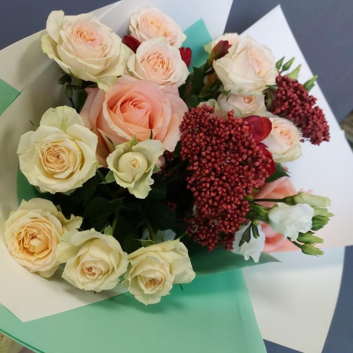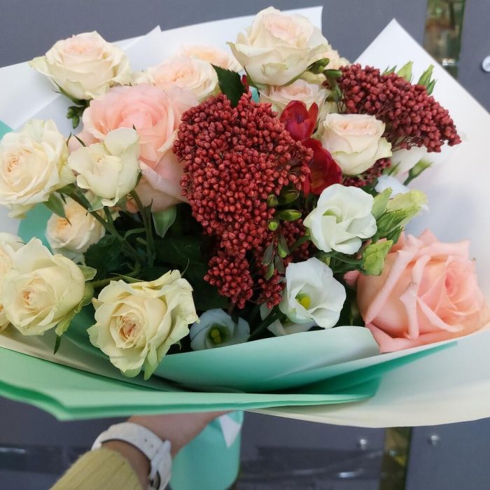 Роза Эквадор 60 см – 3 шт.Лизиантус – 2 шт.Роза кустовая – 2 шт.Озотамнус – 2 шт.Фрезия – 3 шт.Упаковка дизайнерская – 3 шт.Лента атласная – 2 шт.