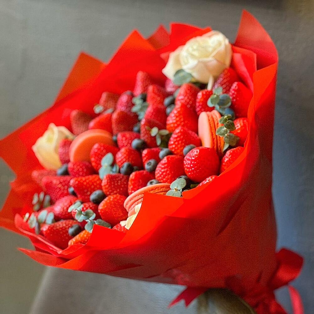 Клубника – 500 гр.Голубика – 100 гр.Роза – 3 шт.Макарон – 3 шт.Зелень – 3 шт.Дизайнерская упаковка – 1 шт.Открытка – 1 шт.Прозрачная пленка – 1 шт.