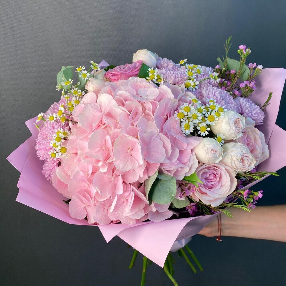 Ваксфлауэр – 1 шт.Хризантема кустовая – 4 шт.Эвкалипт – 1 шт.Роза Эквадор – 3 шт.Ромашка кустовая – 3 шт.Роза кустовая пионовидная – 2 шт.Упаковка дизайнерская – 1 шт.Гортензия розовая – 1 шт.Альстромерия Микс Европа – 2 шт.