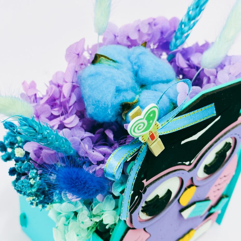 Упаковка дизайнерская – 1 шт.декоративные элементы – 3 шт.лагурус (сухоцвет) разноцветный – 5 шт.гортензия стабилизированная сиреневая – 1 шт.гипсофила стабилизированная бирюзовая – 1 шт.гортензия стабилизированная тиффани – 1 шт.пшеница (сухоцвет) разноцветный – 2 шт.хлопок (сухоцвет) голубой – 1 шт.кашпо деревянное фигурное сова – 1 шт.