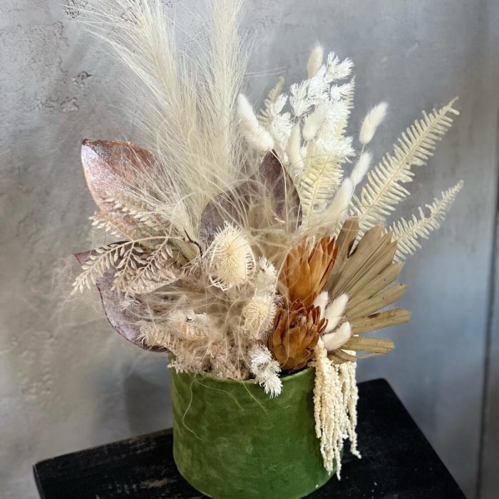 Коробка шляпная бархатная – 1 шт.протея сухоцвет – 2 шт.Лист магнолии – 1 шт.папоротник ветка – 1 шт.папоротник стабилизированный – 1 шт.эрингиум стабилизированный – 2 шт.лист пальмы сухоцвет – 1 шт.Ковыль – 3 шт.аспарагус стабилизированный – 1 шт.кортадерия ( бежевая ) – 2 шт.лагурусы (сухоцвет) – 10 шт.амарант стабилизированный – 1 шт.Оазис флористический – 1 шт.