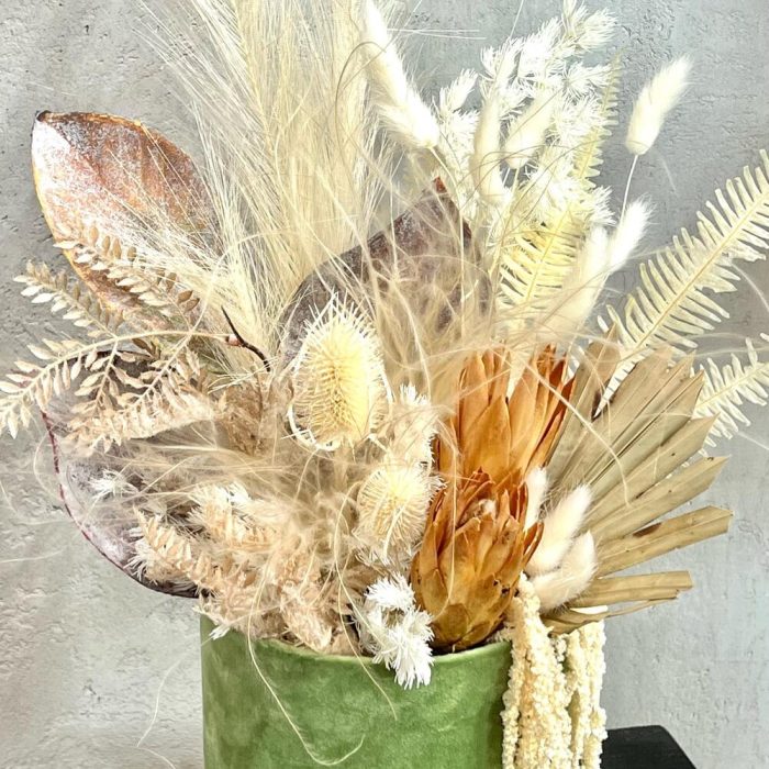 Интерьерная композиция из сухоцветов в бежево/фисташковых оттенках прекрасно дополнит любой интерьер. Пушистый ковыль добавит композиции лёгкости, а бархатная коробочка завершает уютный образ.