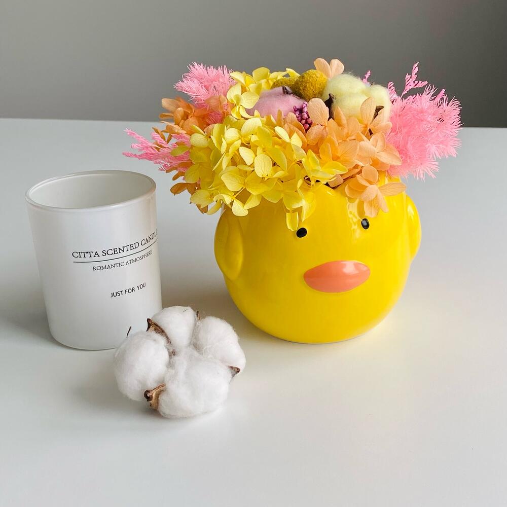 Милый керамический малыш с сухоцветами и стабилизированными цветочками.Цветы не завянут, будут радовать несколько лет.Уход:- водой не поливать- на солнышко и подоконник не ставить