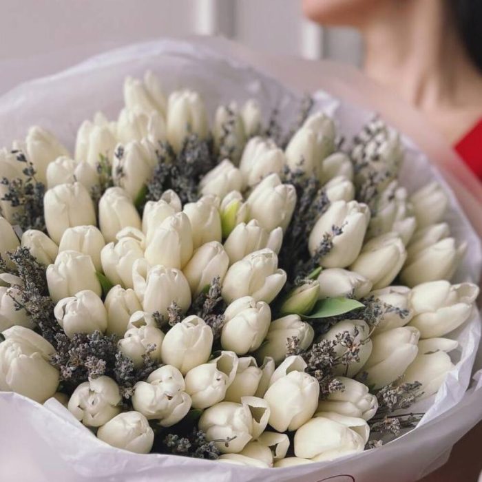 белые тюльпаны – 71 шт.Лаванда – 15 шт.Упаковка дизайнерская – 1 шт.