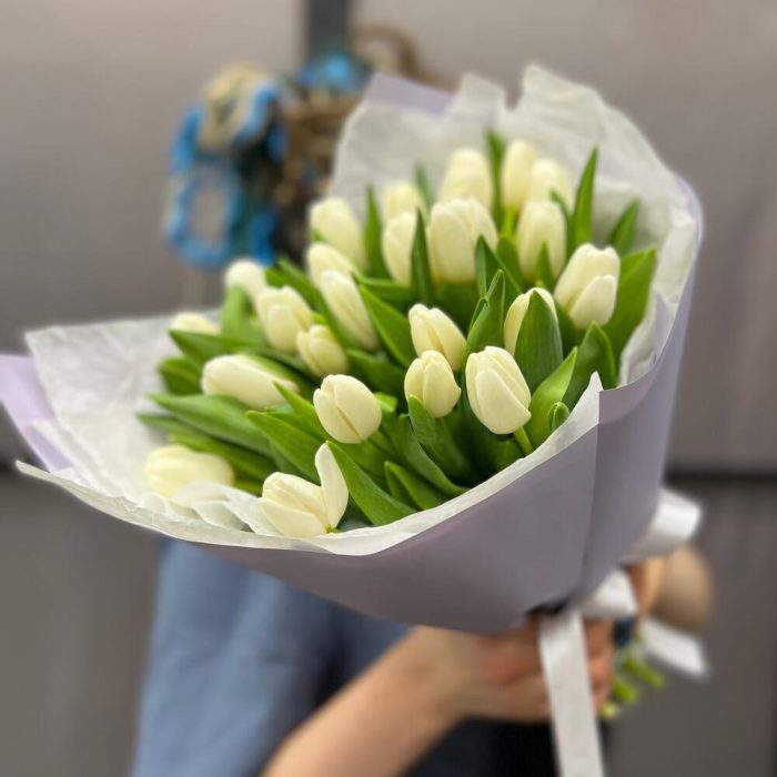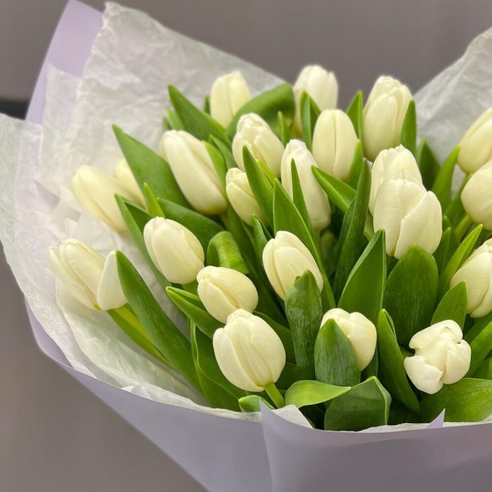 Лента атласная – 2 шт.Тюльпан белый – 25 шт.Пленка матовая – 2 шт.Тишью белое – 2 шт.